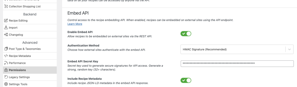 Before your recipes can be embedded anywhere, the Embed API needs to be enabled on the WP Recipe Maker > Settings > Permissions page.